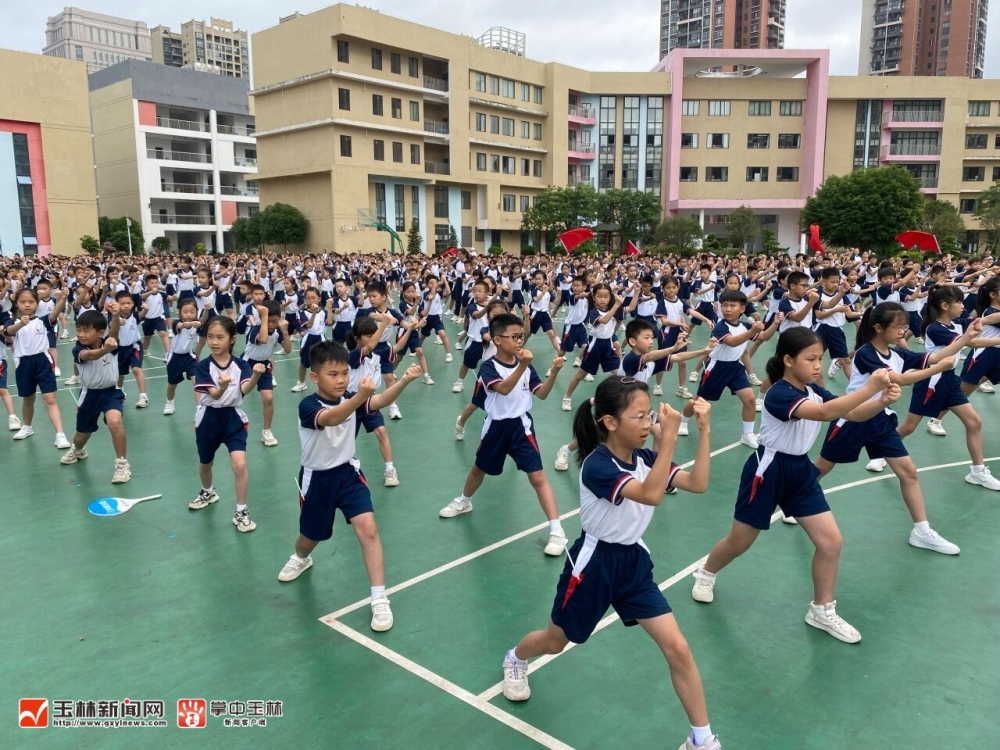 玉林城区近万名小学生参与到“禁毒武术操 禁毒旗帜传递”快闪活动中。